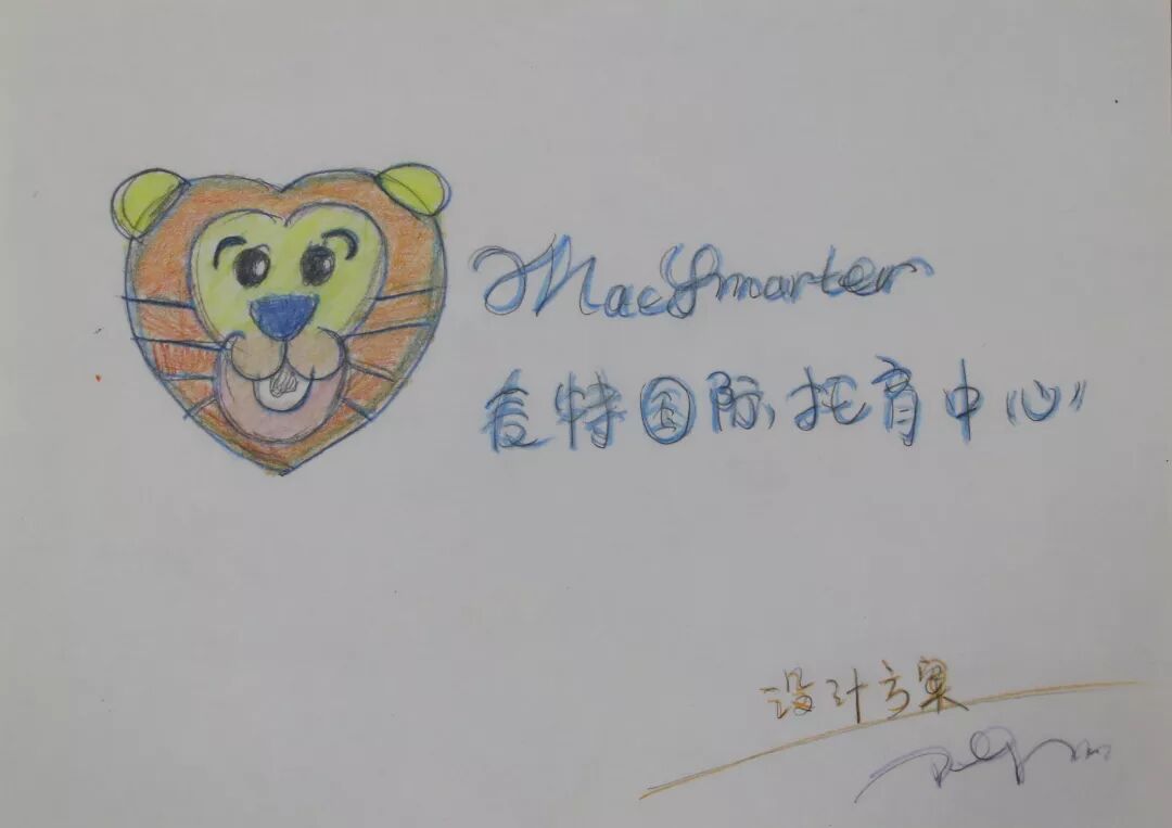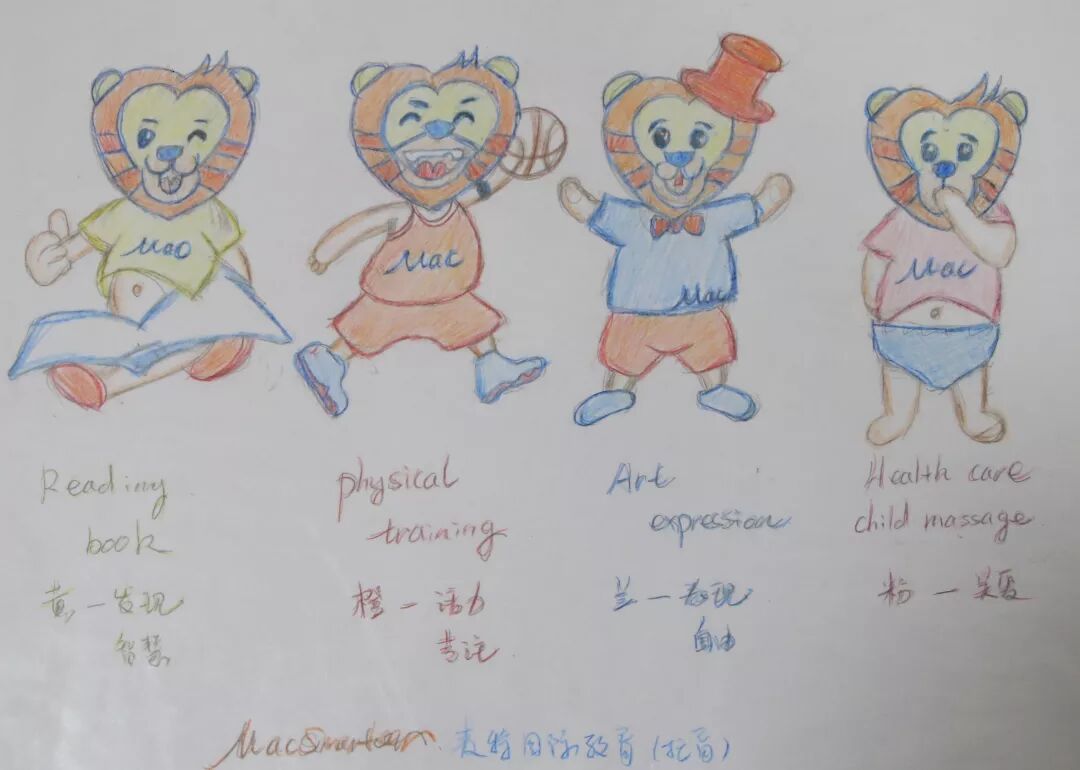 然后自己绘图,整个区位的分布,颜色的搭配都是她自己来。就连托育中心的logo也是自己画出来的,小狮子也更有英式象征。不会用软件就画到纸上,再请设计师用软件做出来。
