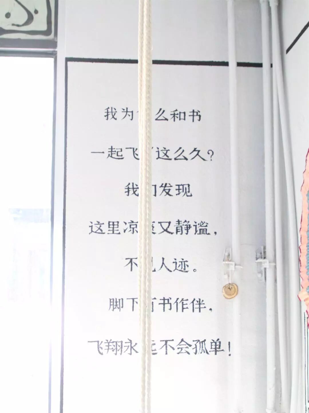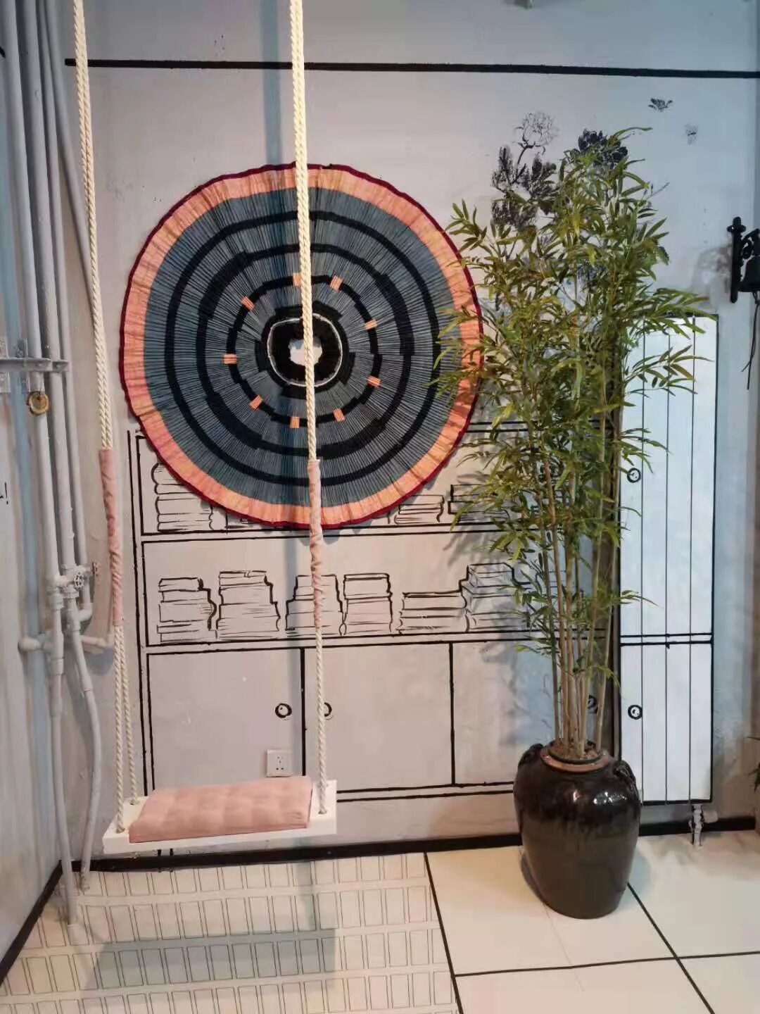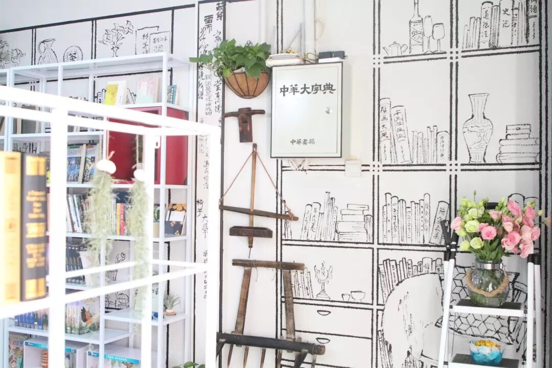 店里陈设温馨,少女心的秋千,复古的台灯,发黄陈旧的珍藏版书籍,以及线稿设计的墙壁,显示了书店主人的精神世界和多样的生活情趣。
