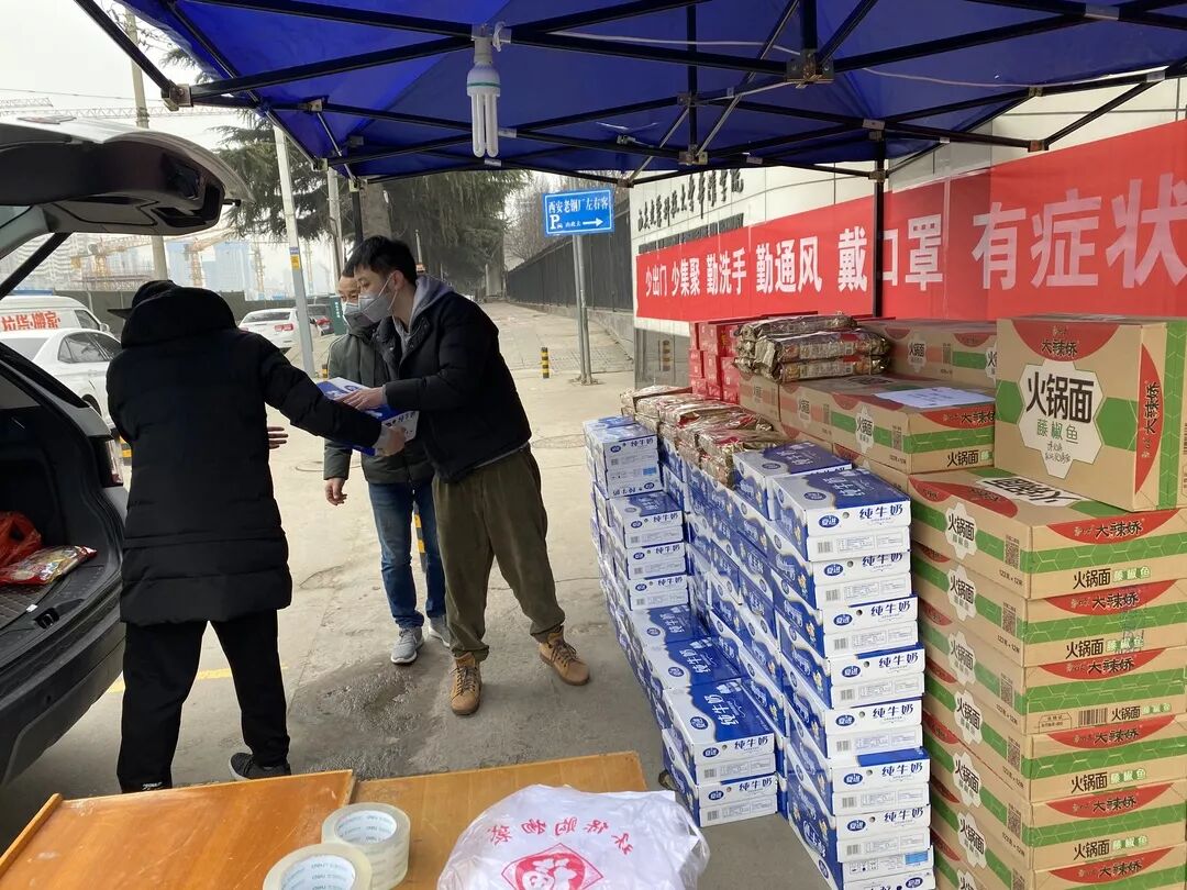 物资紧张,员工们积极联系身边资源,辗转寻找物资。为了限制人员流动,西安城区区域实行机动车管制。员工自己的车出不来,借朋友的车,四辆车,近千余箱物资,6个人,一箱一箱的搬,一趟一趟的送。
