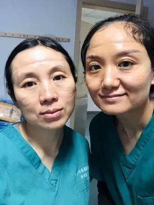 一线医务工作者由于几天连轴转的高强度工作,被防护镜和口罩勒出了深深的印子。