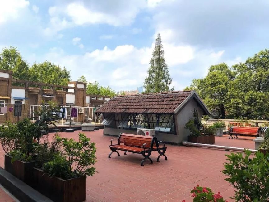 露台上原本裸露的水泥地铺上了红砖,大楼居民们有了更好的休息场所。