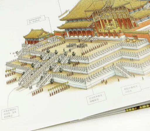 《建筑的故事》通过紫禁城的剖面图,让读者可以从整体上看到建筑内部的构造和设计理念。图纸采用彩色铅笔绘制,并在图中画了一些人物,为读者提供了良好的比例感,让读者能够感受人与建筑的关系。